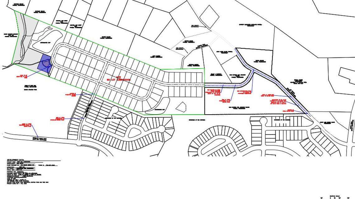 A submitted sketch plan shows an entrance off JW Wilson, off of Whites Road, to the east. An entrance from the south comes off Trentwood Drive, from Sparkling Brook Parkway and the Waterside subdivision. The westernmost part of the property shows, on the plan, a small park area to be dedicated to the town. That piece bumps up against Banks Athletic.