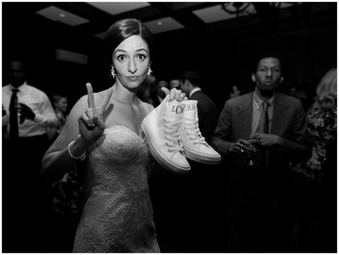 Basketball is a huge part of Chris’ life—he played at Davidson and now works for the NBA — and our wedding date was also right after March Madness, so it was a fun to incorporate a basketball tournament bracket with our guest seating chart. My stepmom, Ginger, did all of the embroidery for mine and my bridesmaid’s getting ready shirts, as well as my dancing shoes, which was another personal touch.