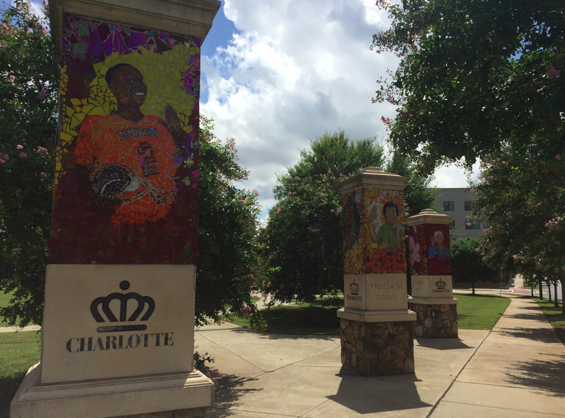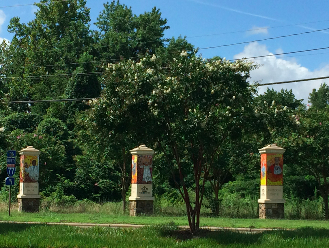 Not far from Pinky’s are pillars lined with glass mosaic artwork that border Freedom Drive. This is a 2006 work by artist Cheryl Foster of Temple Hills, Md., with the support of the Arts & Science Council and The Public Art Commission. The pillars depict neighborhood population diversity, from a butterfly, to a black male student in a basketball uniform, to a cardinal, to an elderly black woman raising her hand, to a white male chef holding a bundle of carrots, to an Asian boy waving.