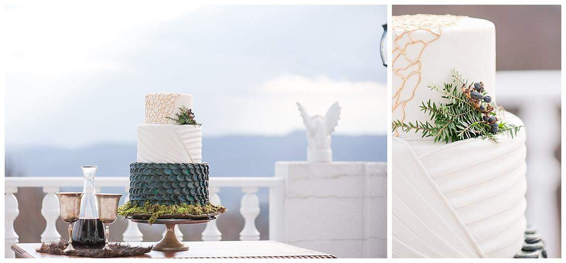 When we reached out to Celestial Cakery about the cake, the only thing we knew was that we wanted to incorporate the dragon scales in some way. We actually had some moss that was being using on the table that was brought out and added to the cake stand to tie everything together.