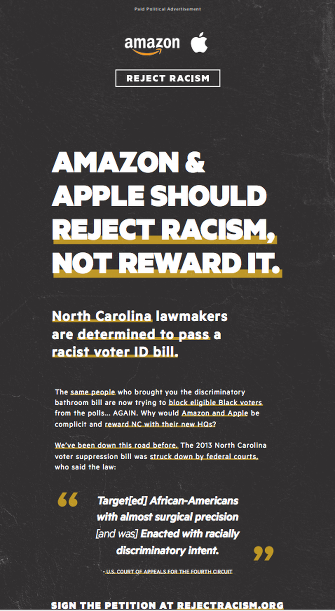 This story was originally published June 7, 2018 at 6:50 PM with the headline "Apple and Amazon told to stay away from NC because of 'racist voter ID' bill."