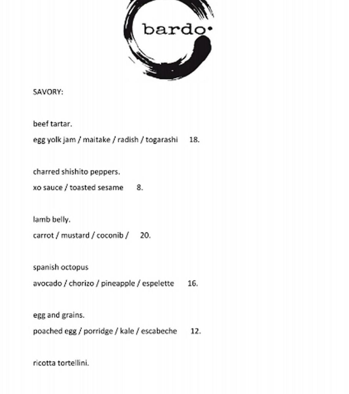 Expect Bardo to stay small and focused on ingredients and execution, with a tight kitchen staff. Pressed to give an example of a dish he's excited about, he described a dry-aged beef tenderloin served with kimchi butter, Carolina Gold rice and wakame, an edible seaweed. Expect the menu to change often based on available ingredients or his own inspiration: "Electic, chef-driven, technique-driven."