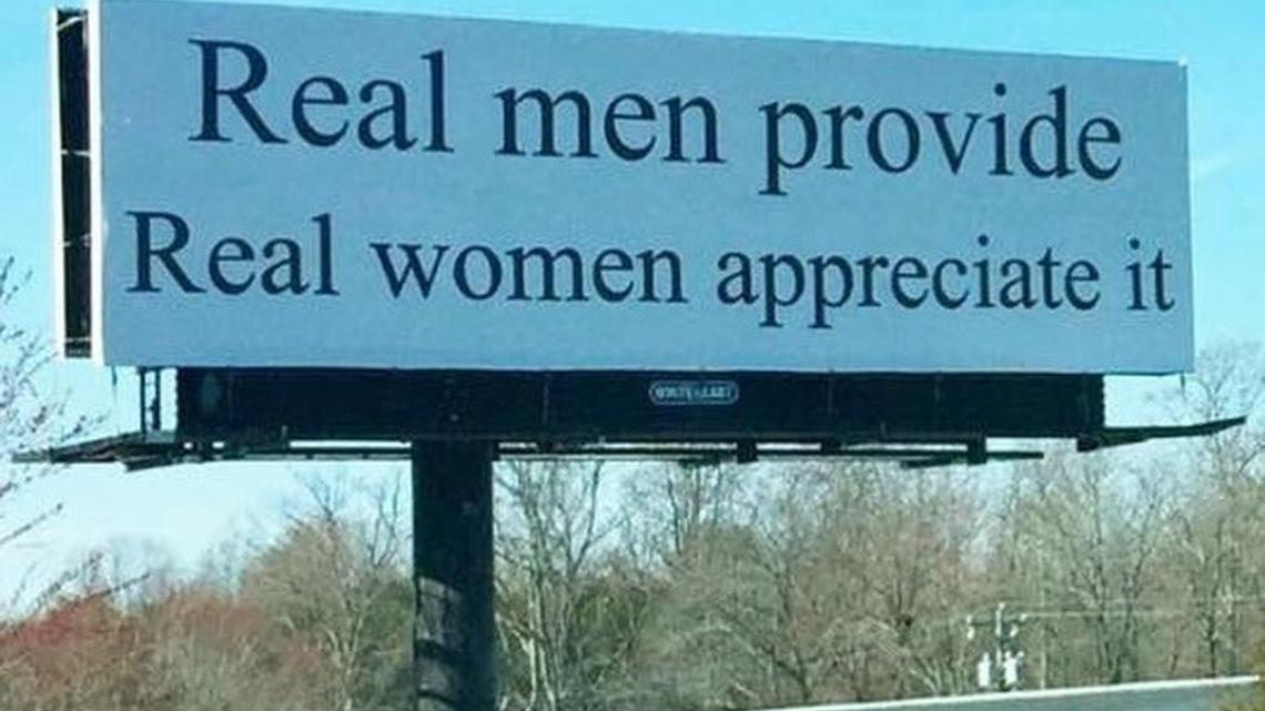 The board reads: “Real men provide. Real women appreciate it.” The owner of a Winston-Salem women’s boutique called Kleur has organized a demonstration against the billboard’s message for Sunday at 11 a.m.