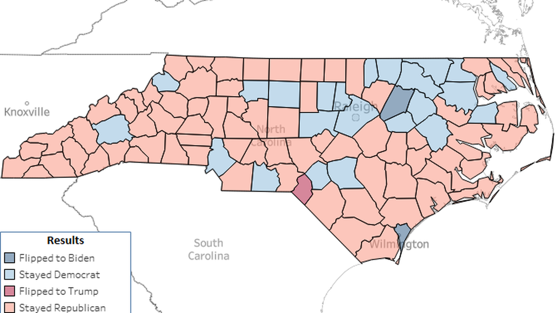 Trump flipped one — Scotland County near the South Carolina border. Democratic candidate Joe Biden flipped two — New Hanover County on the coast and Nash County, northeast of Raleigh.