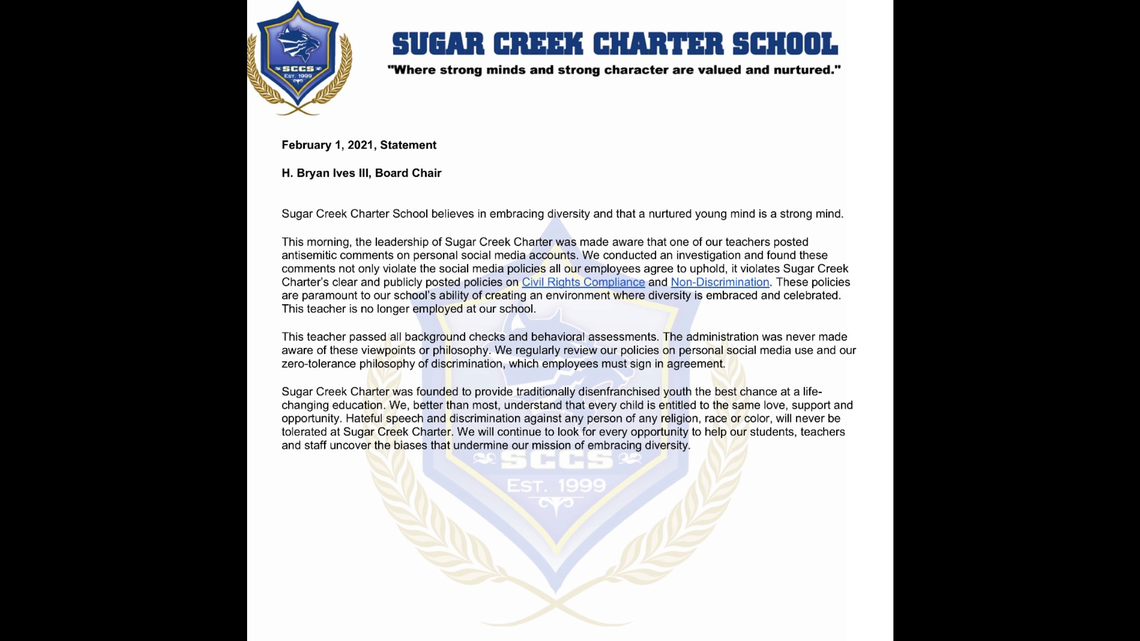 In a statement Monday afternoon, Sugar Creek board chair H. Bryan Ives III said that the school investigated a teacher for posting anti-Semitic comments on a personal social media account, and that the teacher was no longer employed by the school. The school did not specify whether he was fired or if he resigned.