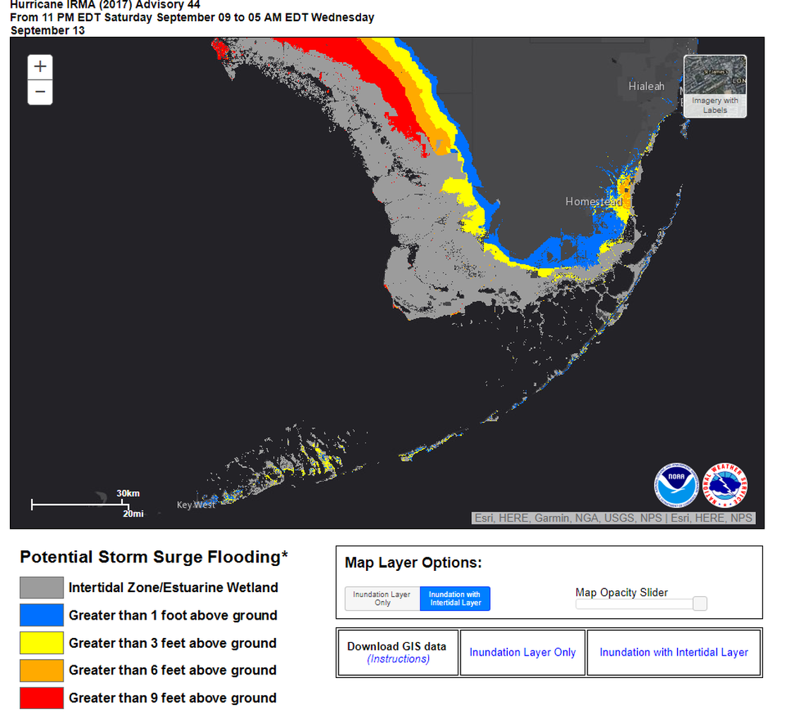 Storm surge remains a very dangerous threat to the chain of low-lying islands, with water levels expected to rise between five and 10 feet through the morning. Flooding could be worse because the surge coincides with the arrival of high tides, Futterman said. The highest elevations in the Keys are in Key West and Key Largo, but most of the other islands sit less than six feet above sea level, he said. Just before 4 a.m., water levels around Key West were already two feet above normal, the Service reported.