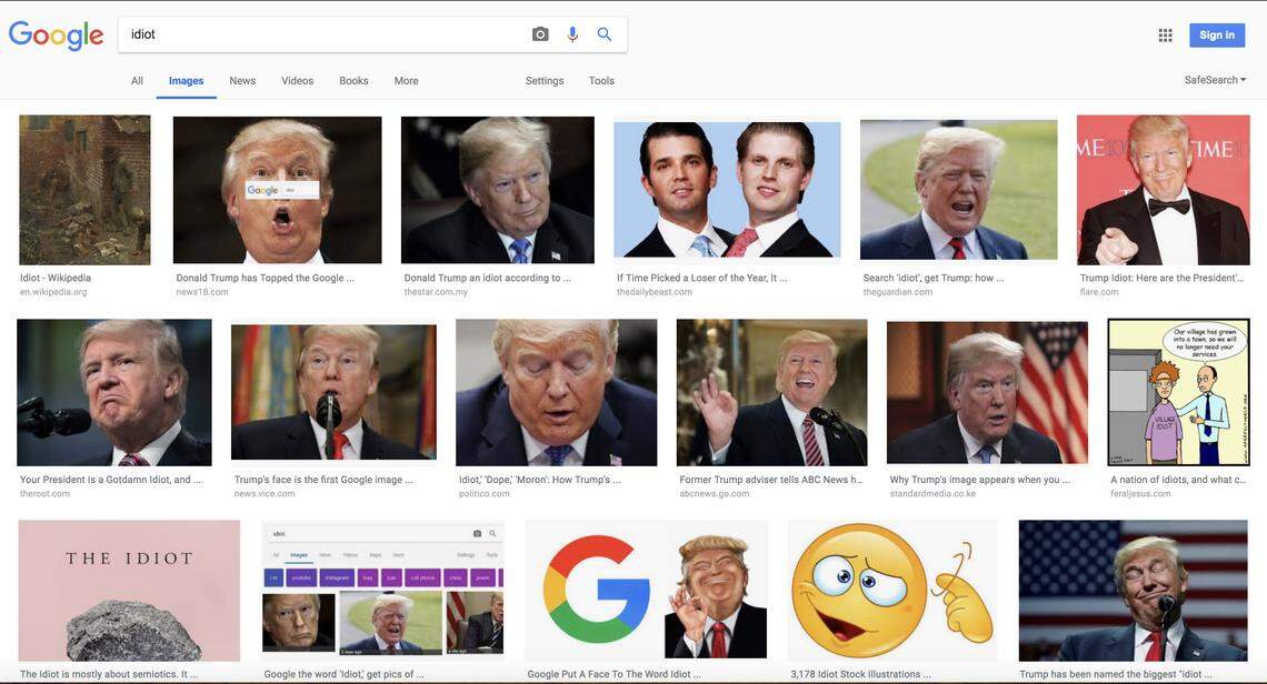 When a McClatchy reporter did an image search for “idiot” on Tuesday after the question was asked, all but four of the top 17 pictures that came up included the president or his two adult sons. Some of those images were associated with articles about the fact that Googling “idiot” brings up pictures of the president. The first photo that appeared wasn’t actually Trump — it was a Belgian painter’s work called “The Idiot,” which appears on the Wikipedia page for the word “idiot.”