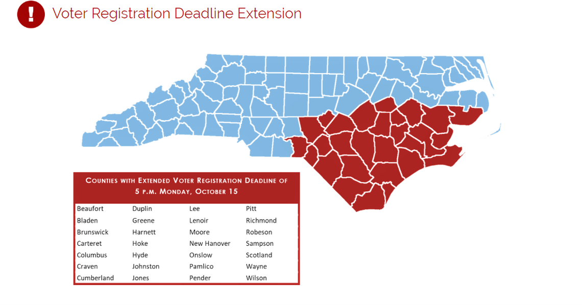 If you live in one of 28 counties in southeastern North Carolina, you have until 5 p.m. Monday, Oct. 15 to register to vote (an extra three days). In those areas, mailed voter registration applications must be postmarked by that date.