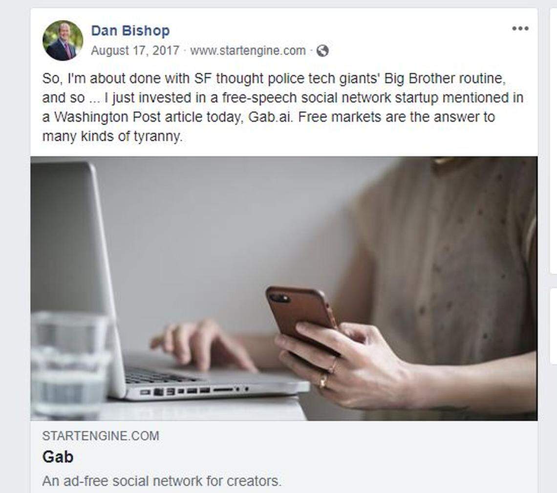 Republican Sen. Dan Bishop said he invested $500 in Gab, which billed itself as a free speech platform. It later became popular with white supremacists and Robert Bowers, the alleged killer of 11 people at Pittsburgh’s Tree of Life synagogue.