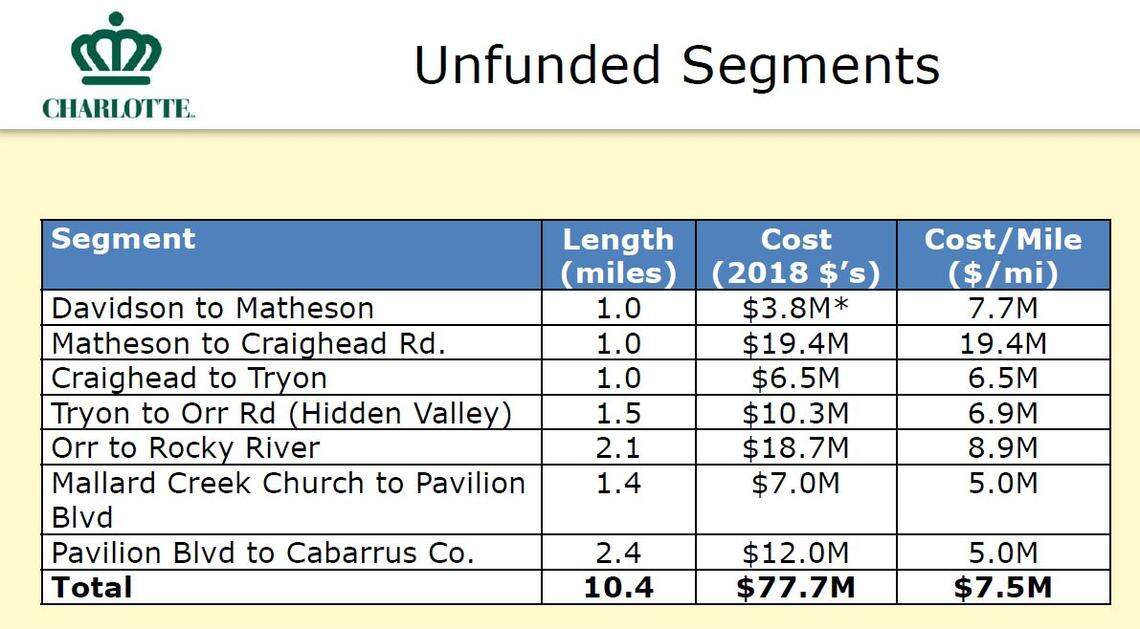 There’s enough funding to complete 18 continuous miles of the trail in Charlotte, largely by linking existing greenway segments with connections between Brandywine and Tyvola roads, Seventh and Tenth streets and Little Sugar Creek to McMullen Creek in South Charlotte. The $38 million in available funding will build 3 more miles of trail, leaving 10.4 miles unfunded.