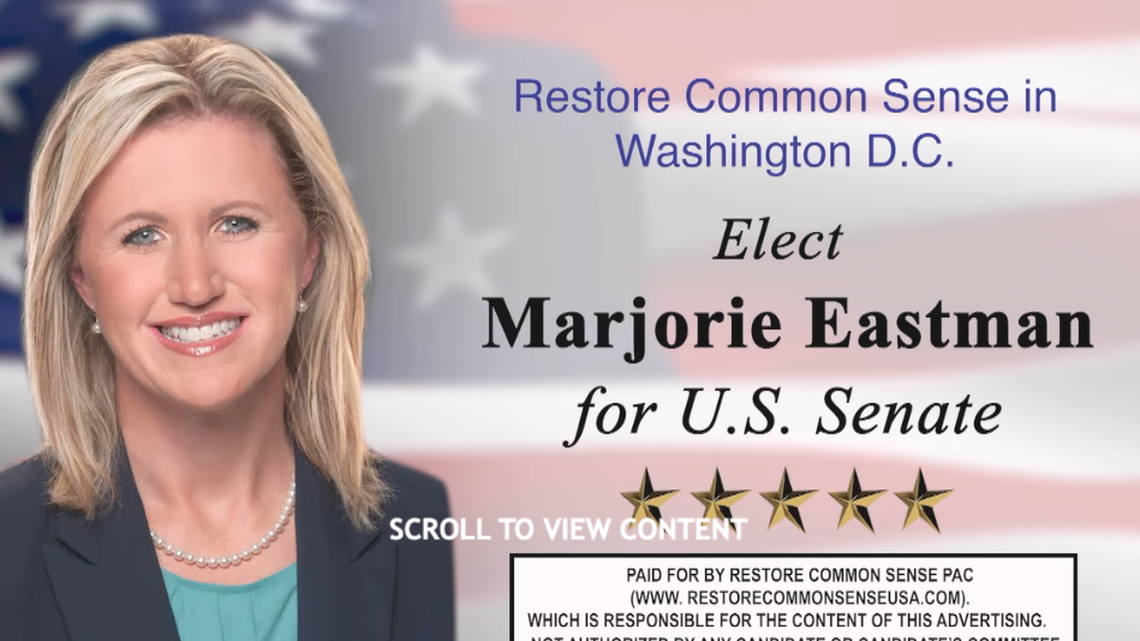 “Our enemies view America as weak,” a Restore Common Sense-funded ad backing Eastman states. “Restore Common Sense in Washington D.C. Elect Marjorie Eastman for U.S. Senate.”
