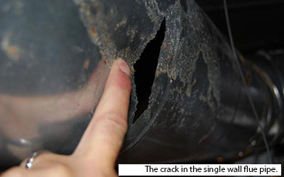 The 10-inch diameter pipe was supposed to remove carbon monoxide from the heater to the outdoors, but it had gaping rusted-out holes.