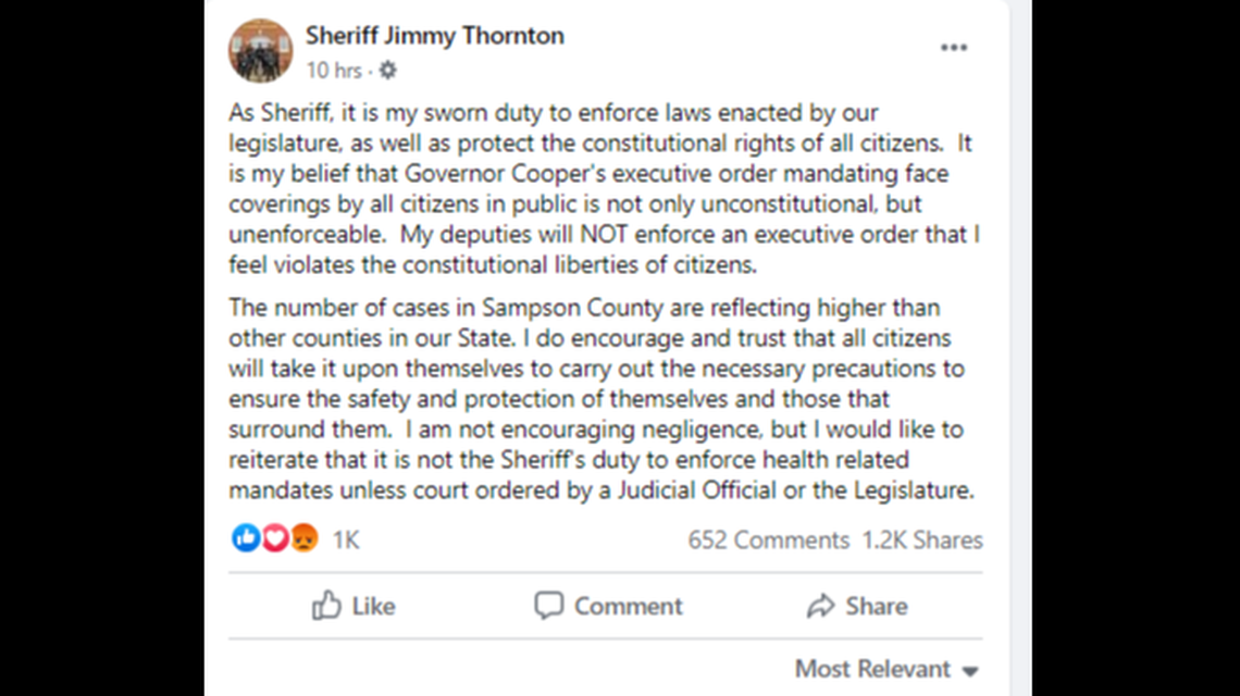 Sampson County Sheriff Jimmy Thornton called Cooper’s mandate “unconstitutional” in a Facebook post and said it would distract officers from criminal investigations. Thornton said he will only take action on the mandate if it was “court ordered by a Judicial Official or the Legislature.”