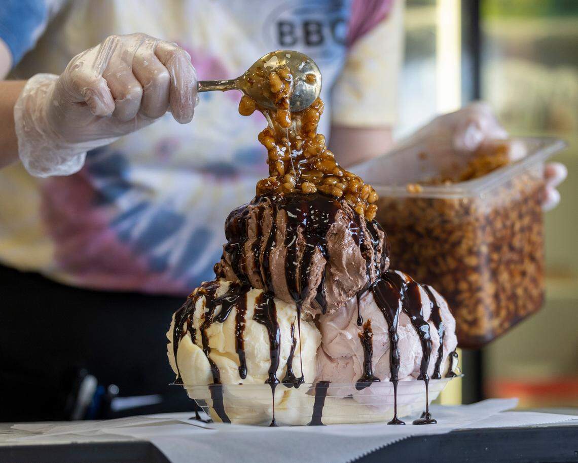 In the dining room of the Barbecue Center a hush might fall in the evening — or maybe gasps and nervous chuckles — as the restaurant’s prized dessert, a four pound banana split, is delivered to a table. Assembly involves three grapefruit-sized scoops of ice cream, bananas, chocolate syrup, walnuts in a candied syrup, a cloud of whipped cream draped over it all and a cherry on top.