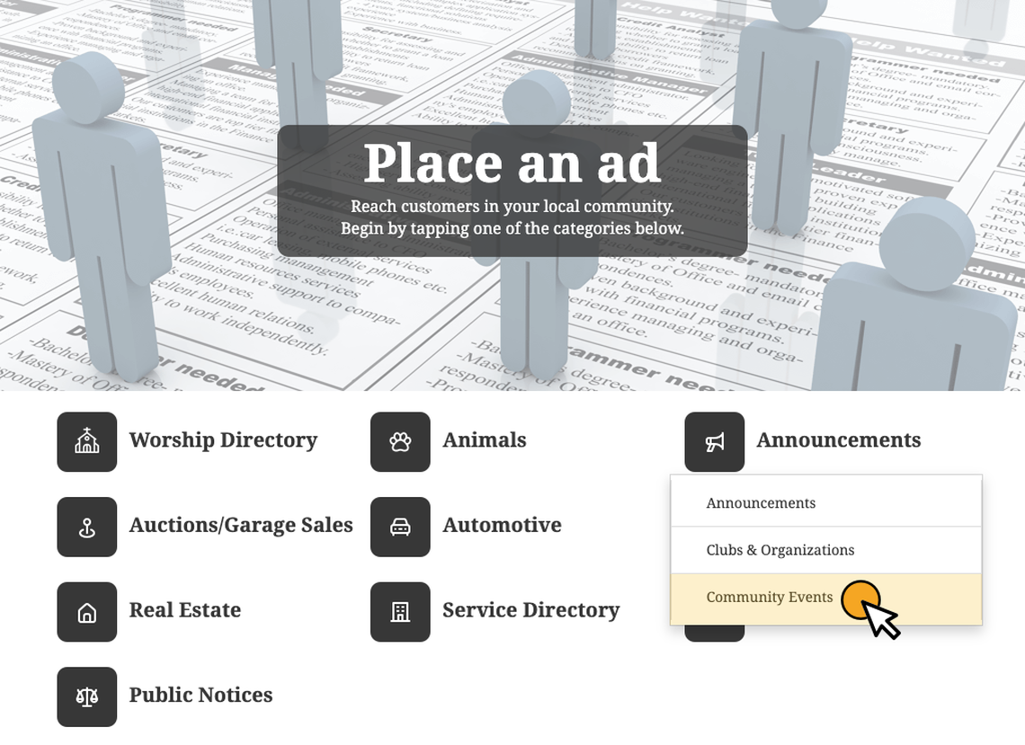 2) Open the Announcements pop-up menu. On the Place Ad page, click the “Announcements” button and select “Community Events” from the pop-up menu.