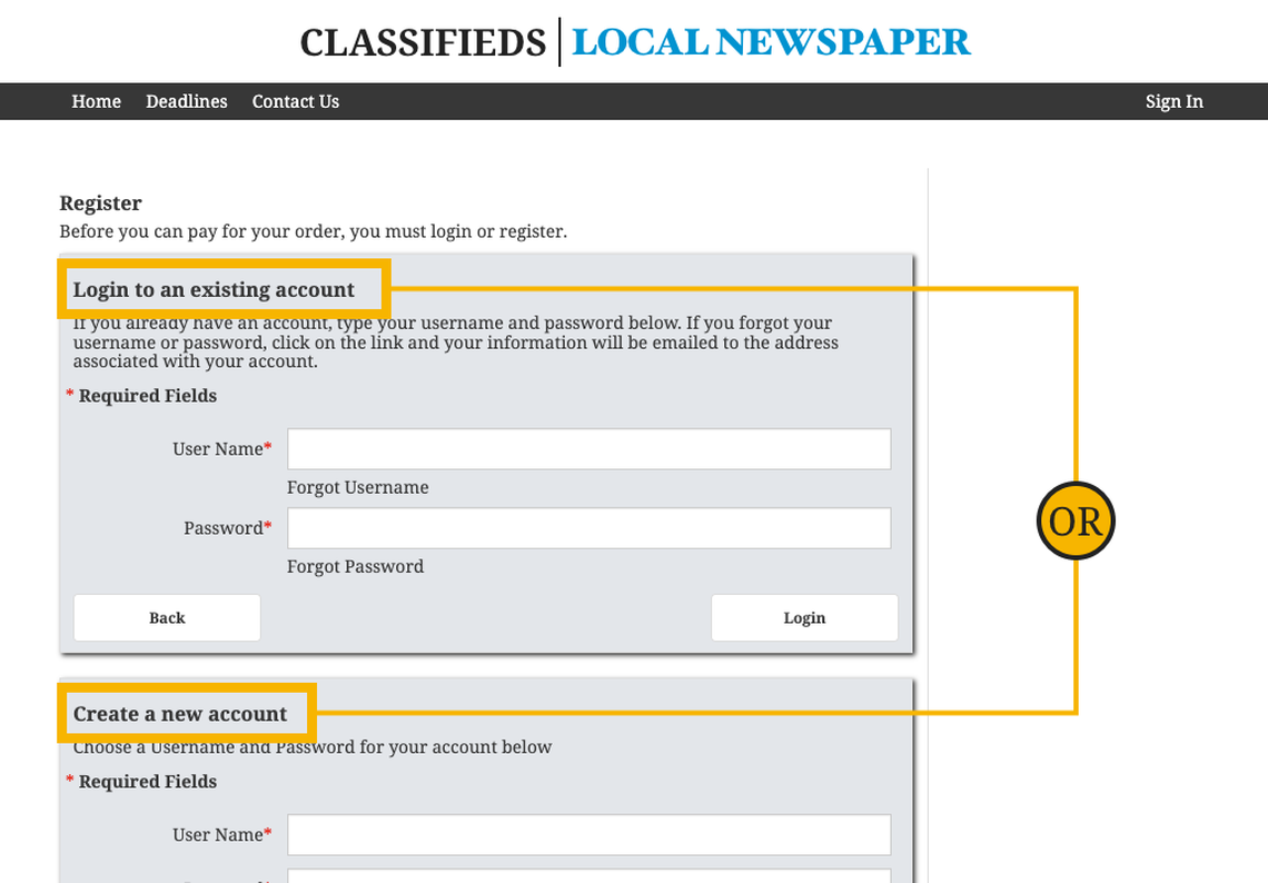 9) View payment screen. Following the Registration/Login page, you will be taken to the Payment screen. If your bulletin has no more than 5 lines, you will be able to submit your ad for free. Otherwise, you will need to add payment information so the ad can be submitted for review. A confirmation message will be sent to the email address listed in your account details.
