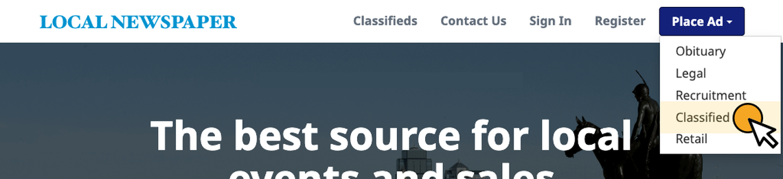 1) Open the “Place Ad” pop-up menu. From our Community Marketplace homepage, click the “Place Ad” button in the top right hand corner and select “Classified” from the pop-up menu.