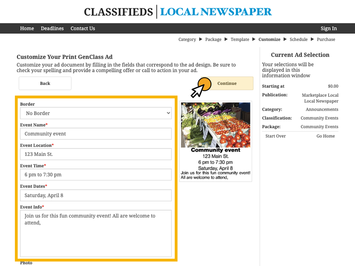 3) Select the Community Events package. You will now be on the package selection page. Locate the box labeled “Community Events Package” and read the requirements for posting a notice for a local bulletin, which include event name, image, location, time, date and description (the first five lines are free; additional lines cost $1.50 per line/per day extra). Click the box to proceed.