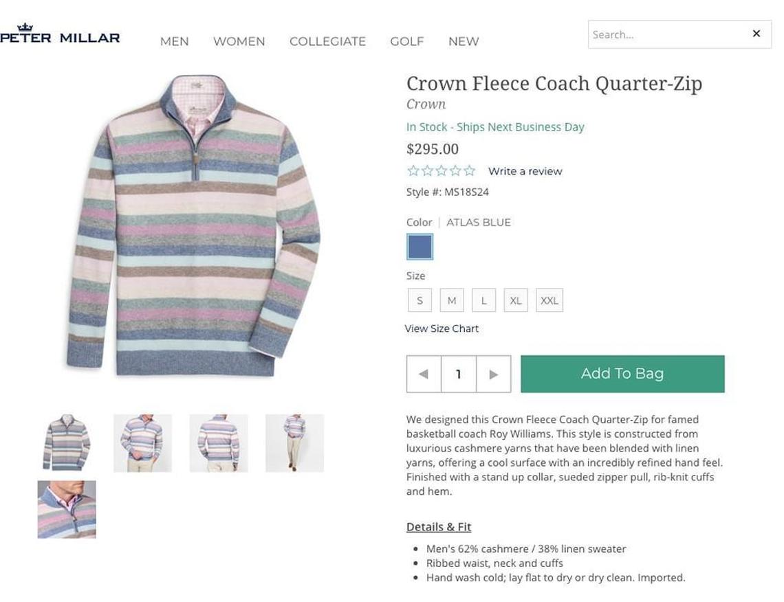 The sweater is a Peter Millar “crown fleece coach quarter-zip sweater” in “Atlas Blue.” The sweater is 62 percent cashmere and 38 percent linen, according to the company’s website, and runs $295.