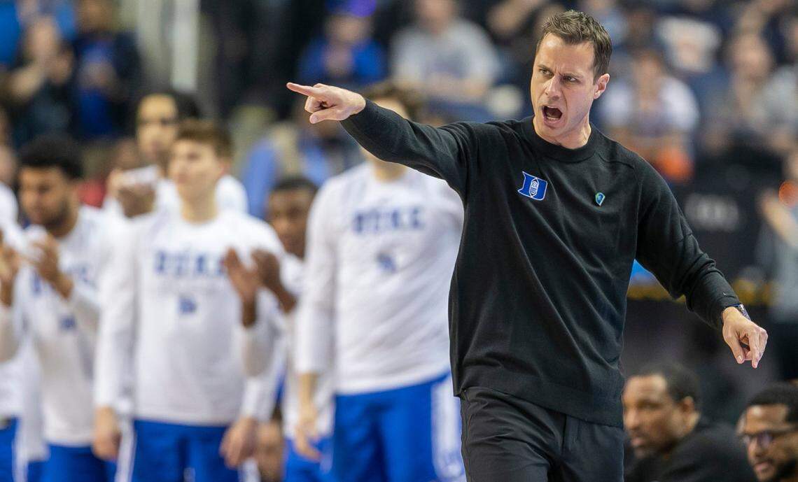 Duke head coach Jon Scheyer celebrates after the Blue Devils’ 59-49 victory over Virginia to win the ACC Men’s Basketball Tournament in Greensboro, N.C., Saturday, March 11, 2023. Ethan Hyman ehyman@newsobserver.com