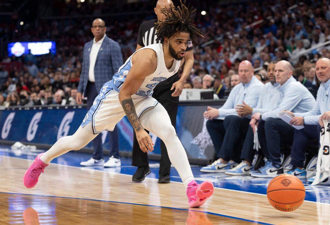 North Carolina’s R.J. Davis (4) reacts after sinking a three point basket in the first half against N.C. State in the first half against N.C. State during the ACC Men’s Basketball Tournament Championship at Capitol One Arena on Saturday, March 16, 2024 in Washington, D.C. Robert Willett rwillett@newsobserver.com