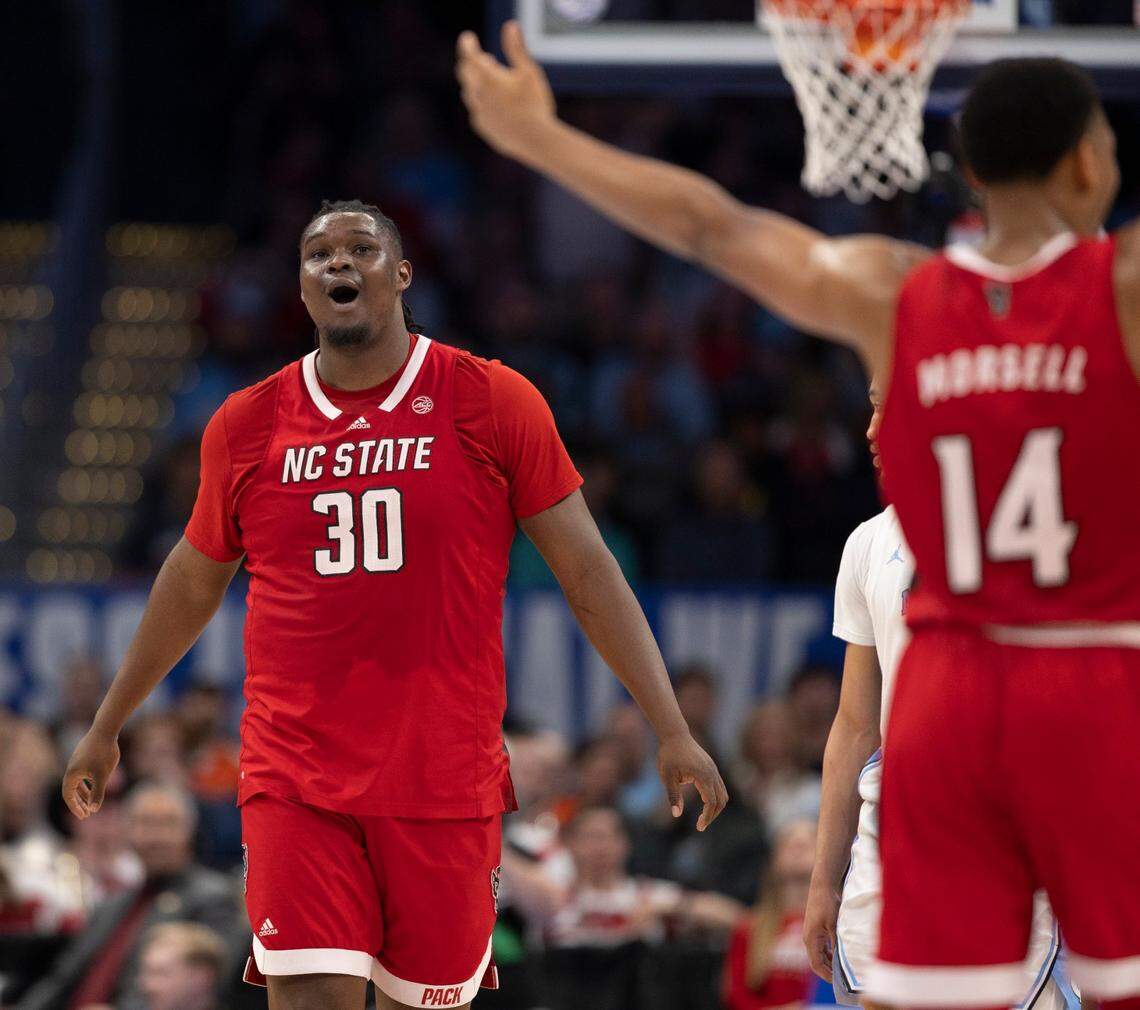 N.C. State’s DJ Burns Jr. (30) works against North Carolina’s Armando Bacot (5) during the first half of N.C. State’s game against UNC in the championship game of the 2024 ACC Men’s Basketball Tournament at Capital One Arena in Washington, D.C., Saturday, March 16, 2024. Ethan Hyman ehyman@newsobserver.com