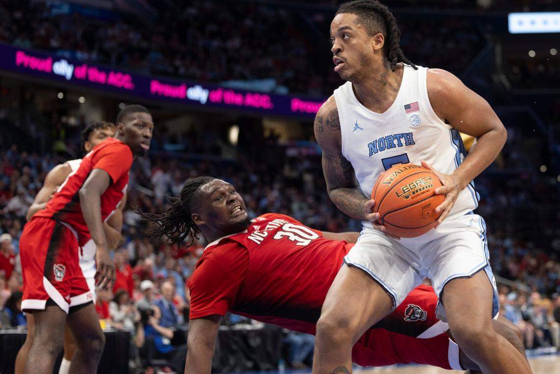 N.C. State’s DJ Burns Jr. (30) is fouled by North Carolina’s Armando Bacot (5) during the second half N.C. State’s 84-76 victory over UNC in the championship game of the 2024 ACC Men’s Basketball Tournament at Capital One Arena in Washington, D.C., Saturday, March 16, 2024. Ethan Hyman ehyman@newsobserver.com