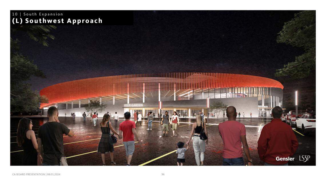 The projects included an overdue expansion to the loading-dock area on the north side of the building — that infrastructure will likely be in the first phase of construction, in the summer of 2025 — reimagined main and upper concourses and a potentially massive expansion of the south side of the building, facing Carter-Finley Stadium, that could include an exterior re-skin of the 25-year-old arena. The authority saw three scaled options for that expansion, with the largest creating a new, multi-story lobby.